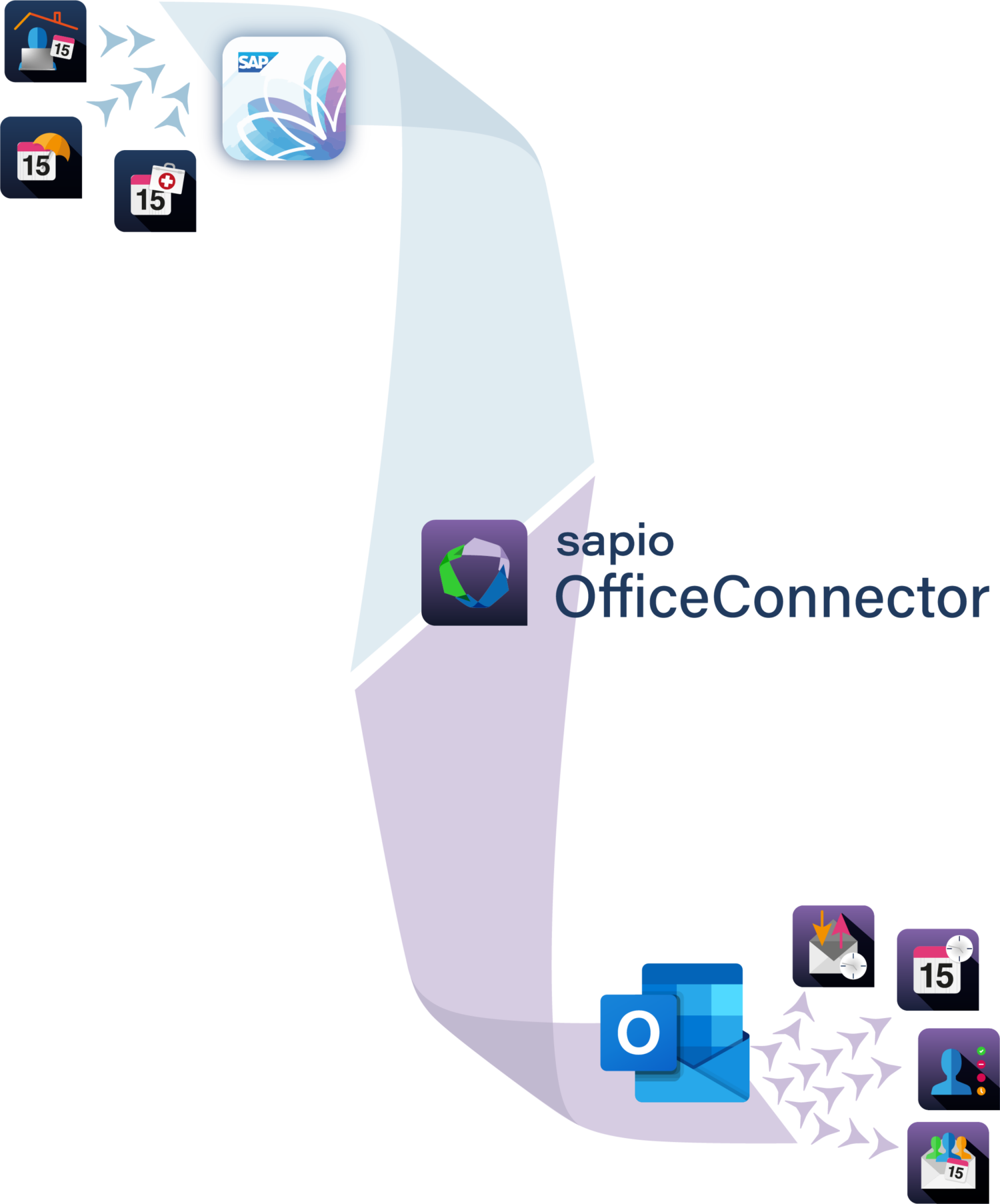 Der sapio OfficeConnector synchronisiert An- und Abwesenheiten mit persönlichen Kalendern sowie Gruppenkalendern und beherrscht auch die automatische Pflege von Abwesenheitsassistenten.